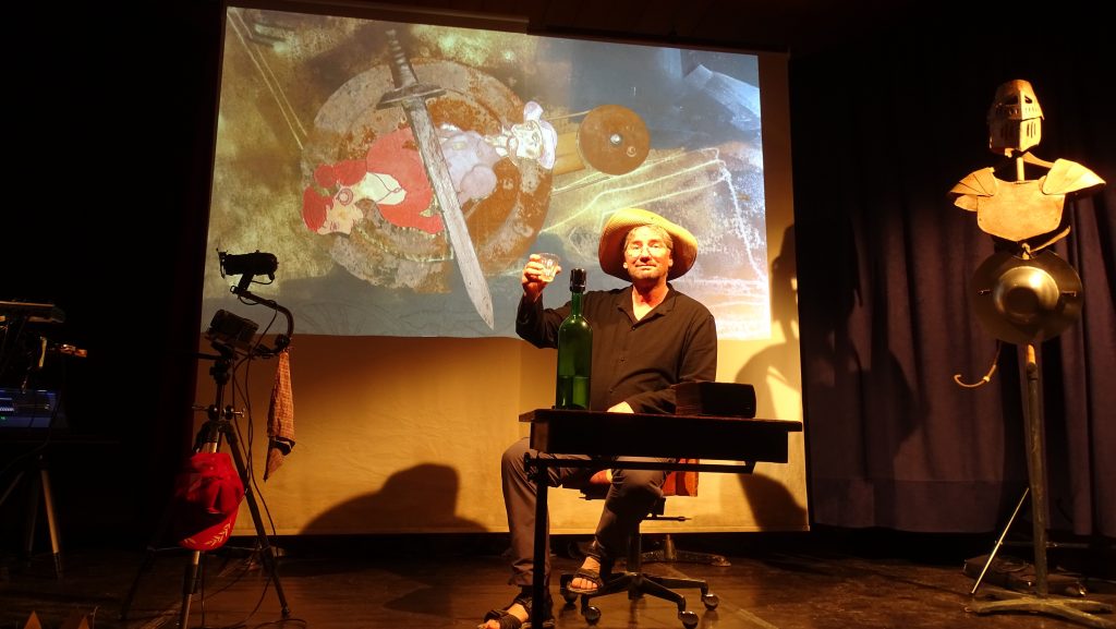 Da sitzt Sancho Panza nun vor dem Bildschirm, seiner virtuelle Stammkneipe, und erinnert sich an seine Zeit mit dem Ritter von der traurigen Gestalt und an all die Abenteuer, die sie zusammen erlebt haben. Nur gut, dass er alles festgehalten hat in Bildern, Videos, Texten und Tönen. Natürlich hat er das eine oder andere etwas aufgehübscht, das macht schließlich jeder.